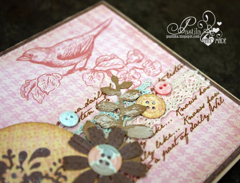 Использовала новую российскую бумагу Garden collection . Вообще наша бумага мне очень редко нравится и по качеству и по принтам, а тут несколько листов оказались очень даже хорошенькие, особенно этот с птичкой!